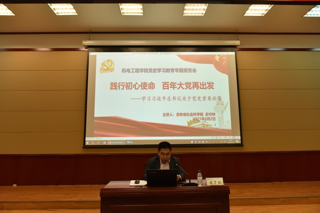 本网讯(通讯员 周子明为庆祝中国共产党的百年华诞,从党的百年伟大奋斗历程中汲取继续前进的智慧和力量,深入学习贯彻习近平新时代中国特色社会主义思想,巩固深化“不忘初心、牢记使命”主题教育成果,激发全体教师爱国爱党的伟大情怀,引领广大青年一定要坚定理想信念,6月2日下午,学院党委邀请到吉林省社会科学院(社科联)党组成员、副院长史守林在学校学术报告厅为大家作了题为《践行初心使命   百年大党再出发》党史学习教育专题报告。学院全体教师、学生党员、入党积极分子聆听了报告会。