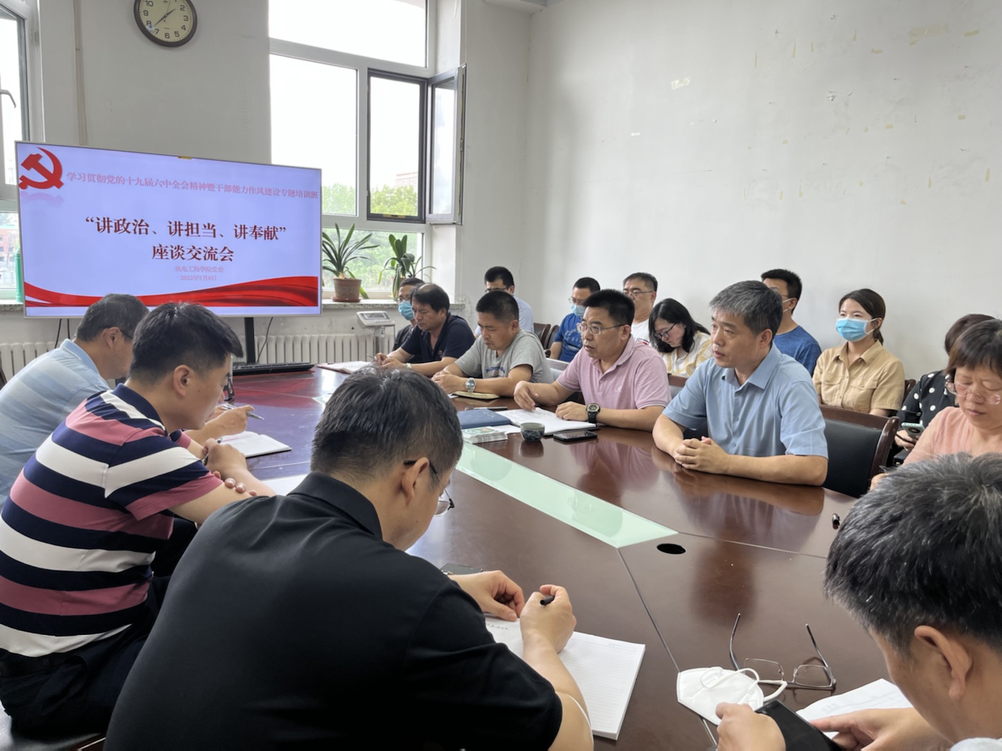 本网讯(通讯员 周子明)7月8日,太阳成tyc7111cc集团党委在1387会议室召开学习贯彻党的十九届六中全会精神暨干部能力作风建设专题培训班“讲政治、讲担当、讲奉献”座谈交流会。会议采用线上线下同步进行,班子成员、系(中心)党支部书记、主任参加了线下会议,其他党员参与线上会议。会议由党委书记李奇涵主持。
