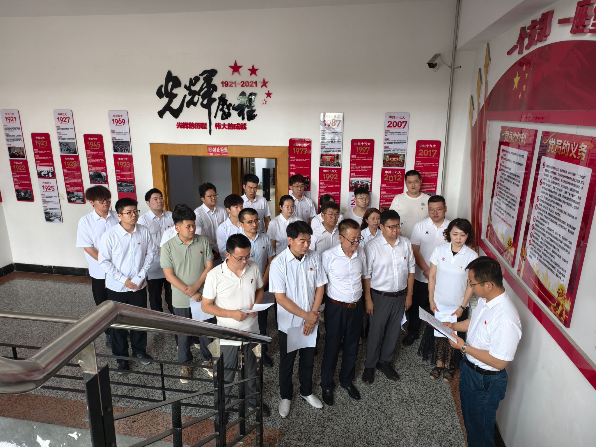 学院党委在党建文化长廊组织了“初心如磐·仪式教育”活动。活动在党委书记张利军的领誓下拉开帷幕,全体党员面向党旗庄严宣誓,重温入党誓词,坚定理想信念,铿锵有力的誓言在长廊内久久回荡。