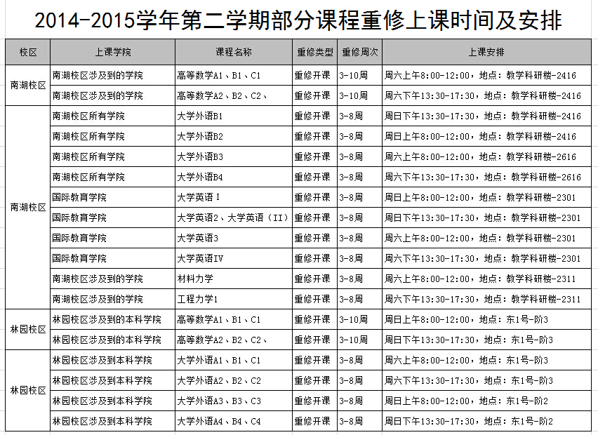 1、以学生自愿的形式组织重修课程的学习及考核,北湖校区2014级同学在本学期不开设重修课程。