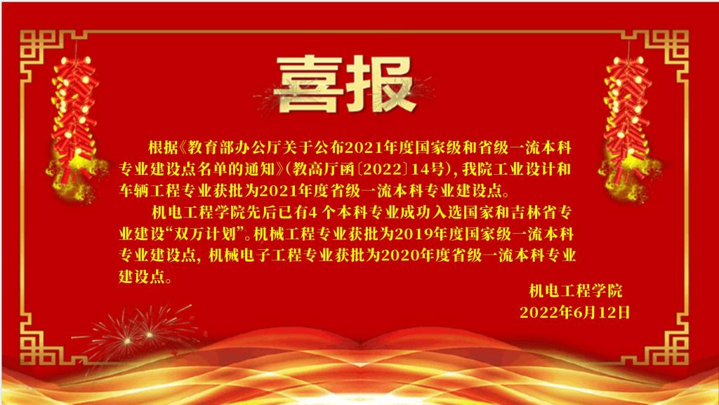 太阳成tyc7111cc集团先后已有4个本科专业成功入选国家和吉林省专业建设“双万计划”。机械工程专业获批为2019年度国家级一流本科专业建设点,机械电子工程专业获批为2020年度省级一流本科专业建设点。