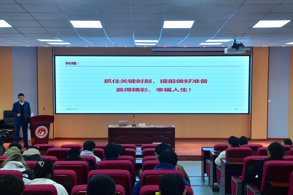 本网讯(通讯员 郑岩)为进一步加强学风建设,引导学生树立正确人生目标、明确努力方向,全面助力提高人才培养质量。11月1日下午,我院特邀人力资源管理资深专家、华为技术有限公司高级顾问、深圳人力资源管理协会理事郭长旺在南湖校区综合三报告厅作了一场主题为“做好职业选择准备,赢得精彩幸福人生”的大学生职业生涯规划报告会,报告会由副院长于保军主持,2021级、2022级本硕学生代表及全体辅导员老师参会。