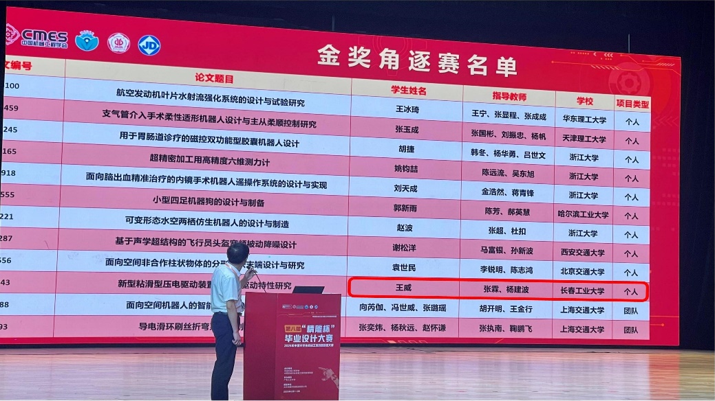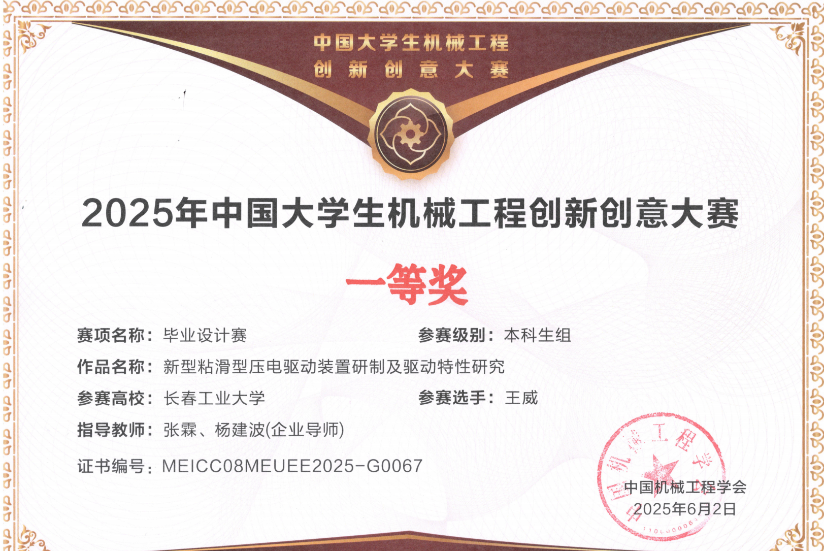 本网讯(通讯员 张霖)2025年6月2日,由中国机械工程学会、中国机械行业卓越工程师教育联盟主办,广东工业大学承办的2025年中国大学生机械工程创新创意大赛第八届“精雕杯”毕业设计大赛全国总决赛顺利举行。太阳成tyc7111cc集团王威同学的作品《新型粘滑型压电驱动装置研制及驱动特性研究》(指导教师:张霖、杨建波)荣获个人赛银奖(全国一等奖)。