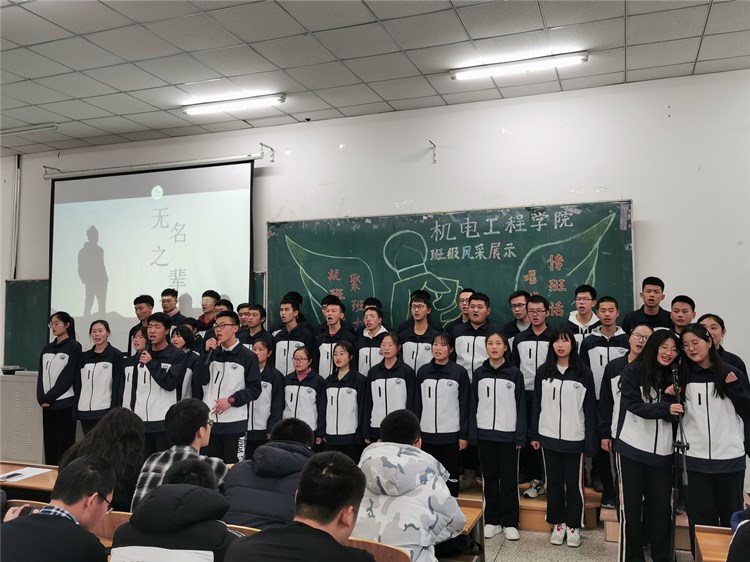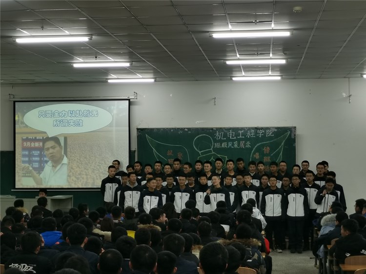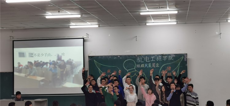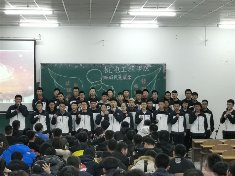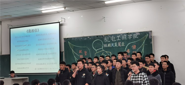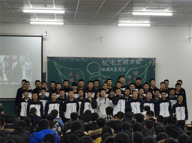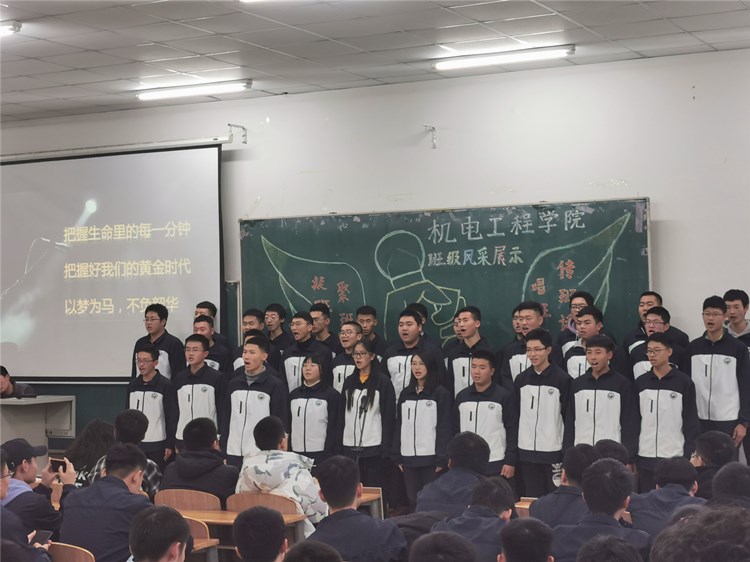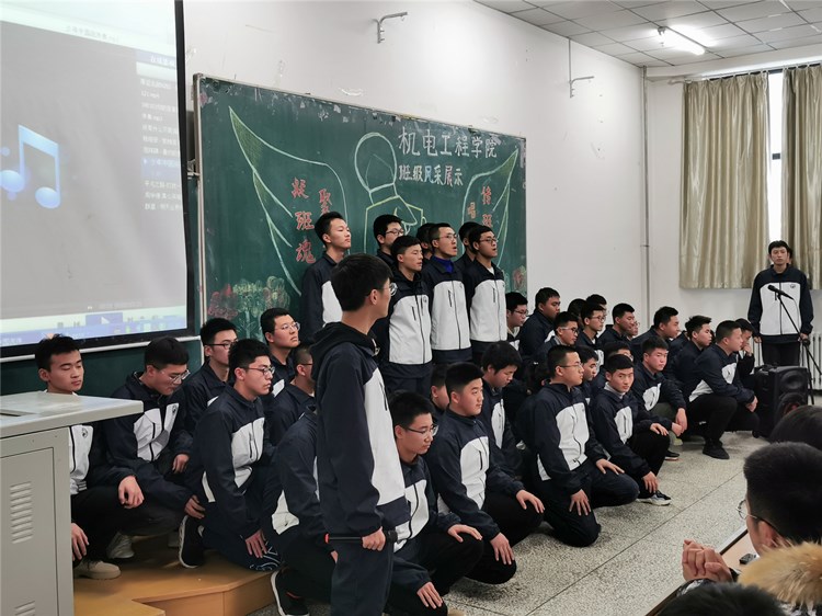 “求真尚美,勤学笃行”“鹰隼试翼,风尘翕张;坚定理想,展翅翱翔”“自信励志,合作竞争”“为梦想坚持不懈,不卑不亢”……11个班级精神慷锵有力,展示着新时代青年大学生向上向善的精神面貌。《少年中国说》《骄傲的少年》《我的梦》《我相信》《明天会更好》……11支班歌大合唱,配合用心编入的舞蹈动作、励志口号,机电“少年们”共同演绎着团结拼搏、激昂向上的班级风貌。