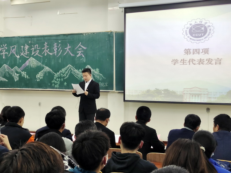 200102班吕佩泽同学做为获表彰学生代表上台发言。在发言中他首先表达了对学校老师的感激之情,然后他提出做为青年学子,要敢于面对新时代赋予我们的挑战,满怀热情,笃学不倦,明确目标,专心一志,就一定能够达到成功的彼岸。